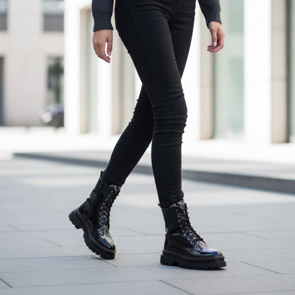 Ghete de dama piele naturala cu siret si fermoar functional la inetrior Confectionate manual din piele naturala negru exterior Interior captusit cu blanita neagra Piele naturala: Talpa groasa neagra. Inaltime talpa in fata 3 cm, in spate 4 cm Brantul bocancilor este prevazut cu un buret special care ofera un plus de comoditate