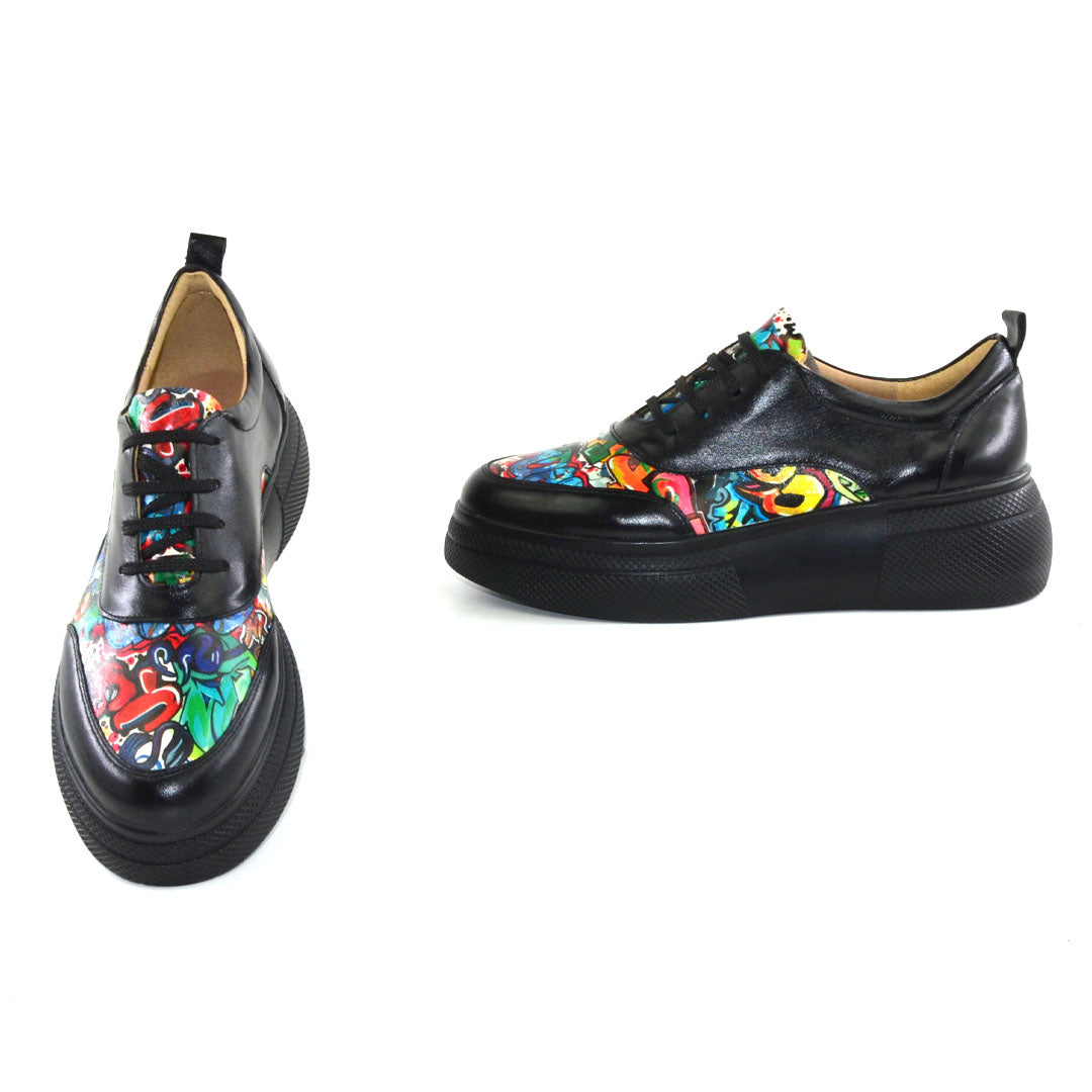 Pantofi sport casual de dama Confectionati manual din piele naturala exterior, interior piele naturala Piele naturala neagra si piele cu imprimeu , Talpa degra extra usoara, foarte confortabila si rezistenta Brantul pantofilor este prevazut cu un buret special care ofera un plus de comoditate Pantofi produsi in Romania