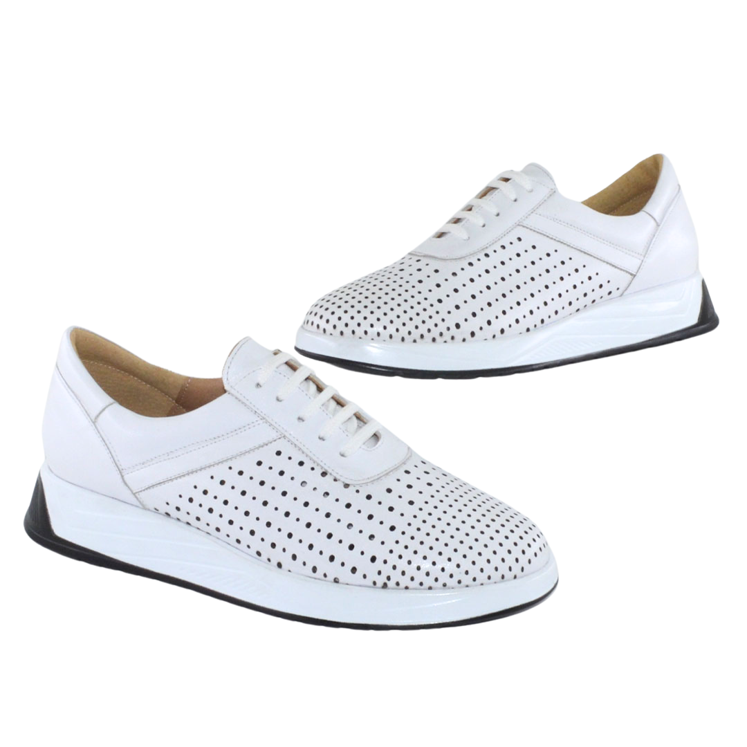 Pantofi sport de culoare alba perforat Pantofi cu siret Confectionati manual din piele naturala exterior si interior Piele naturala de culoare bej Talpa alb+negru extra usoara, foarte confortabila si rezistenta Brantul pantofilor este prevazut cu un buret special care ofera un plus de comoditate Pantofi produsi in Romania