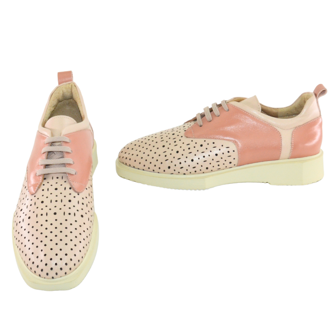 Pantofi oxford de dama cu talpa platforms. Confectionati manual din piele naturala exterior si interior .Piele naturala roz+ bej. Talpa bej extra usoara,flexibila, foarte confortabila si rezistenta, talpa extralite. Brantul pantofilor este prevazut cu un buret special care ofera un plus de comoditate. Pantofi produsi in Romania.