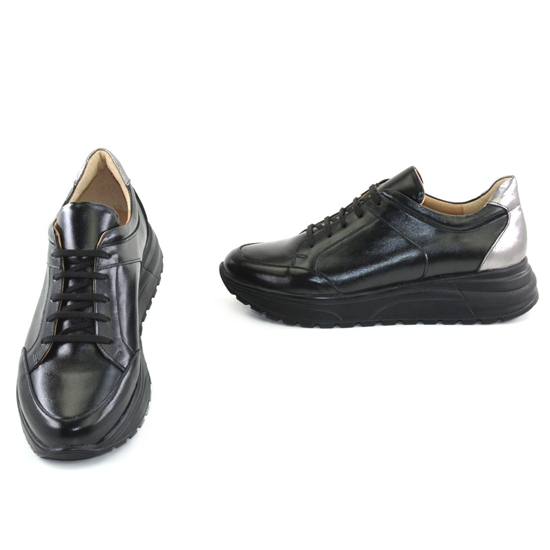 Pantofi sport casual de dama. Confectionati manual din piele naturala exterior, interior piele naturala. Piele naturala neagra argintiu la spate. Talpa extra usoara, foarte confortabila si rezistenta. Brantul pantofilor este prevazut cu un buret special care ofera un plus de comoditate. Pantofi produsi in Romania.
