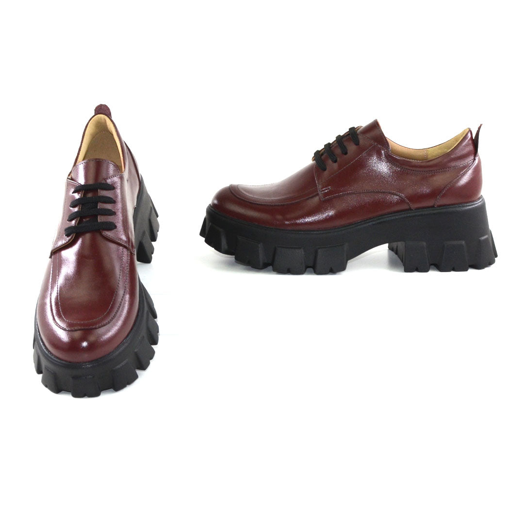 Pantofi casual confectionati din piele naturala box grena Interior din piele naturala -Talpa cu toc 6 cm ofera un plus de inaltime fiind in acelasi timp usoara si confortabila -Design modern potrivit tinutelor sport -casual. Inchidere cu siret.Pantofi produsi in Romania