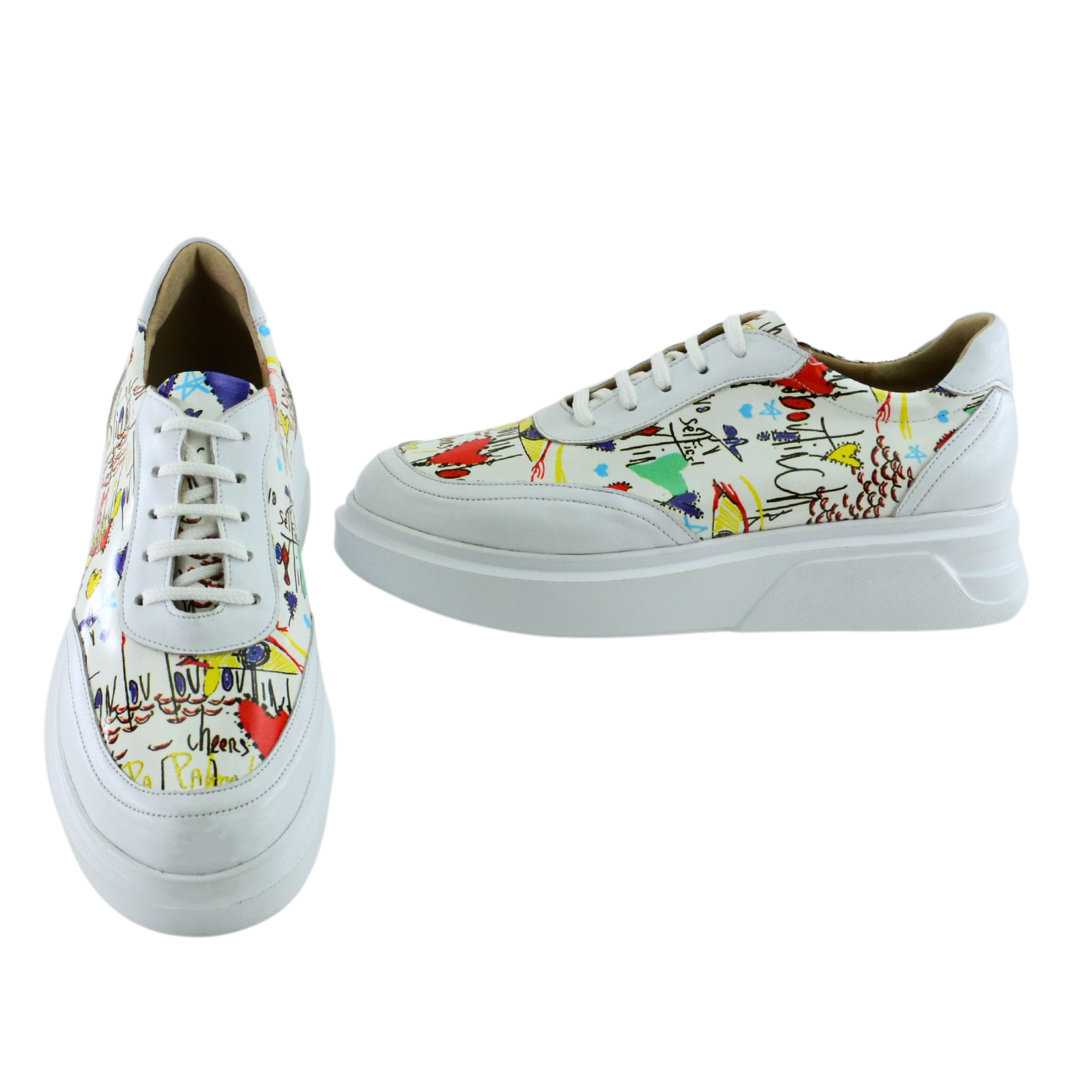 Pantofi sport casual Pantofi cu siret si cu talpa platforms Confectionati manual din piele naturala exterior si interior Piele naturala de culoare alba si imprimeu multicolor Talpa alba cu cant negru extra usoara, foarte confortabila si rezistenta Brantul pantofilor este prevazut cu un buret special care ofera un plus de comoditate Pantofi produsi in Romania
