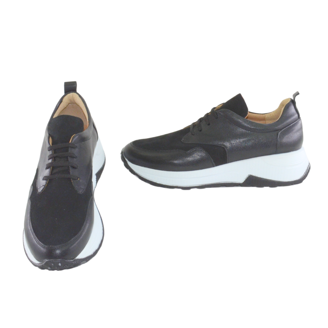 Pantofi sport Pantofi cu siret si cu talpa platforms Confectionati manual din piele naturala exterior si interior Piele naturala de culoare neagra. Talpa alba cu cant negru extra usoara, foarte confortabila si rezistenta Brantul pantofilor este prevazut cu un buret special care ofera un plus de comoditate. Pantofi produsi in Romania.