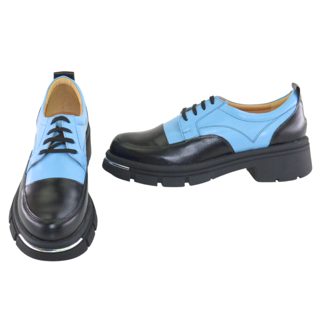 Pantofi tip oxford din piele naturala Confectionati manual din piele naturala exterior si interior Piele naturala: culoare negru + blue. Talpa neagra foarte confortabila si rezistenta Brantul pantofilor este prevazut cu un buret special care ofera un plus de comoditate Pantofi produsi in Romania.