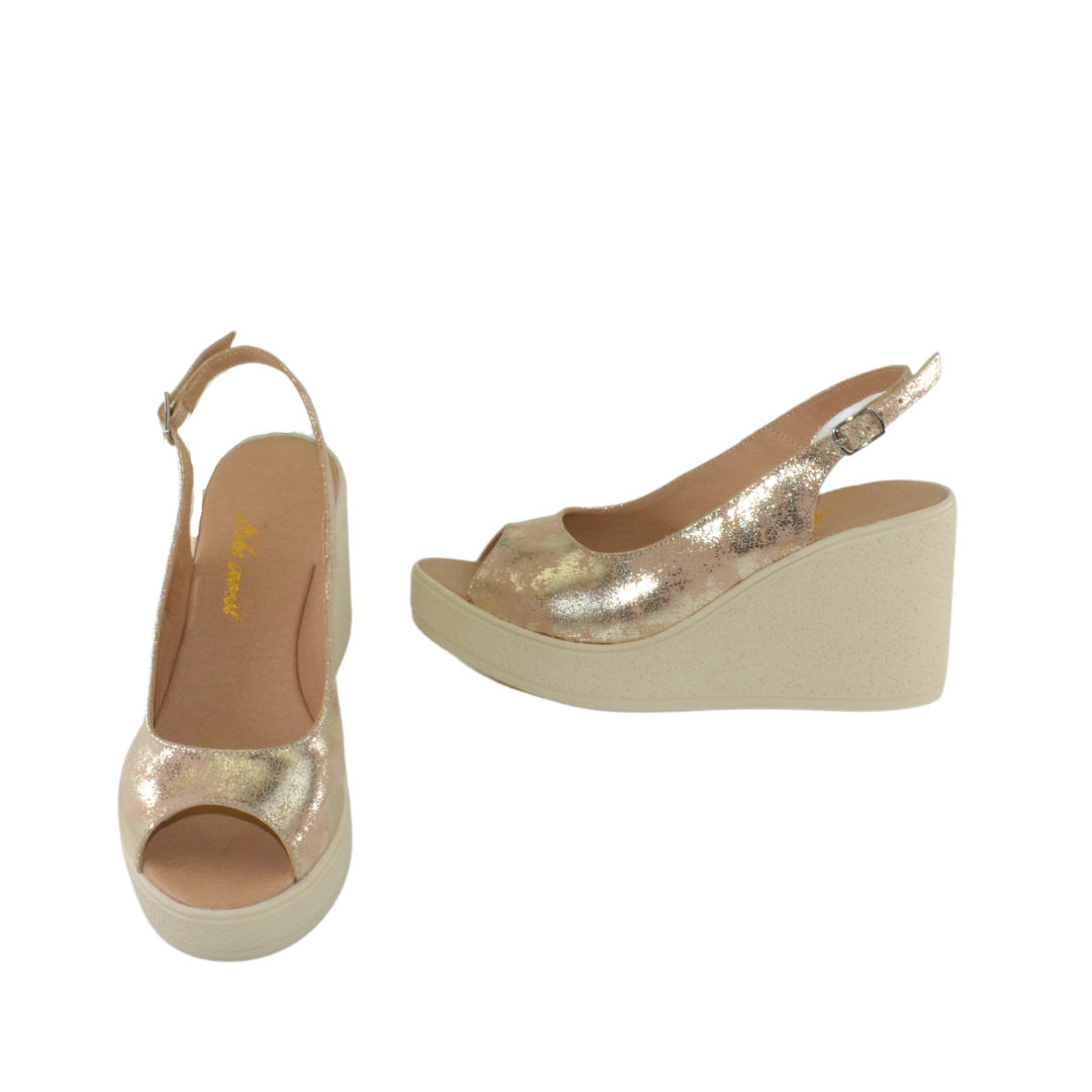 Sandale de dama talpa ortopedica Exterior Piele naturala de culloare bej argintiu varf rotund Interior piele naturala Talpa bej . Inaltime talpi 9 cm spate si 2,5, cm fata Brantul sandalelor este prevazut cu un buret special care ofera un plus de comoditate.