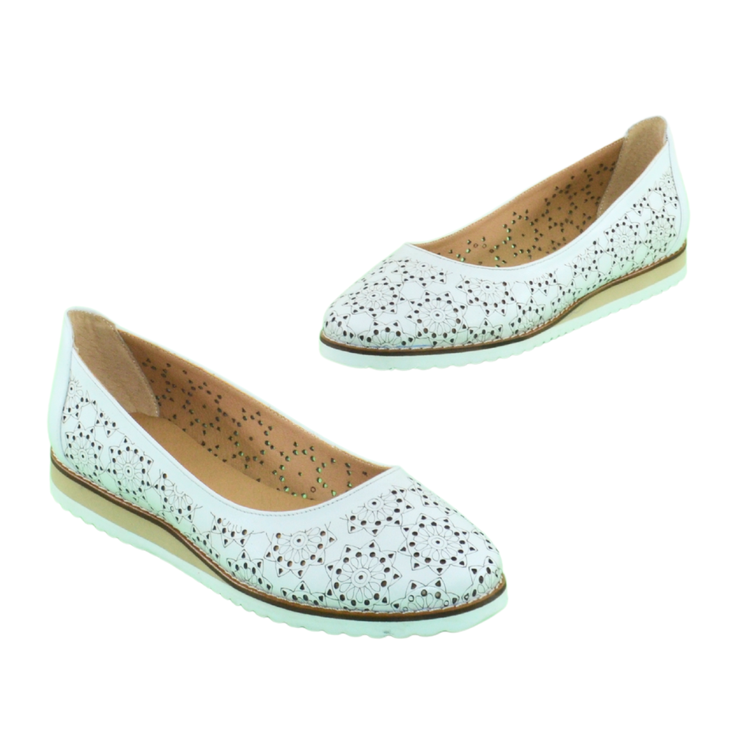 -Balerini din piele naturala cu model perforat -Interiorul din piele naturala -Acest produs este un must have al acestui an fiind destinat tuturor persoanelor dinamice- Ideal pentru plimbarile in aer liber-Varful semirotund reda un plus de eleganta si confort picioarelor dumneavoastra-