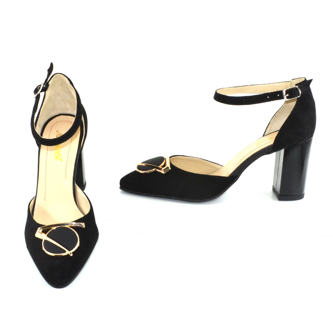 Pantofi decupati din velur negru cu ornament auriu cu negru mat Pantofi cu toc vopsit Confectionati manual din piele naturala exterior si interior , Inaltime toc de 8,5 cm Toc vopsit Brantul pantofilor este prevazut cu un buret special care ofera un plus de comoditate Pantofi produsi in Romania Producator: Nike Invest