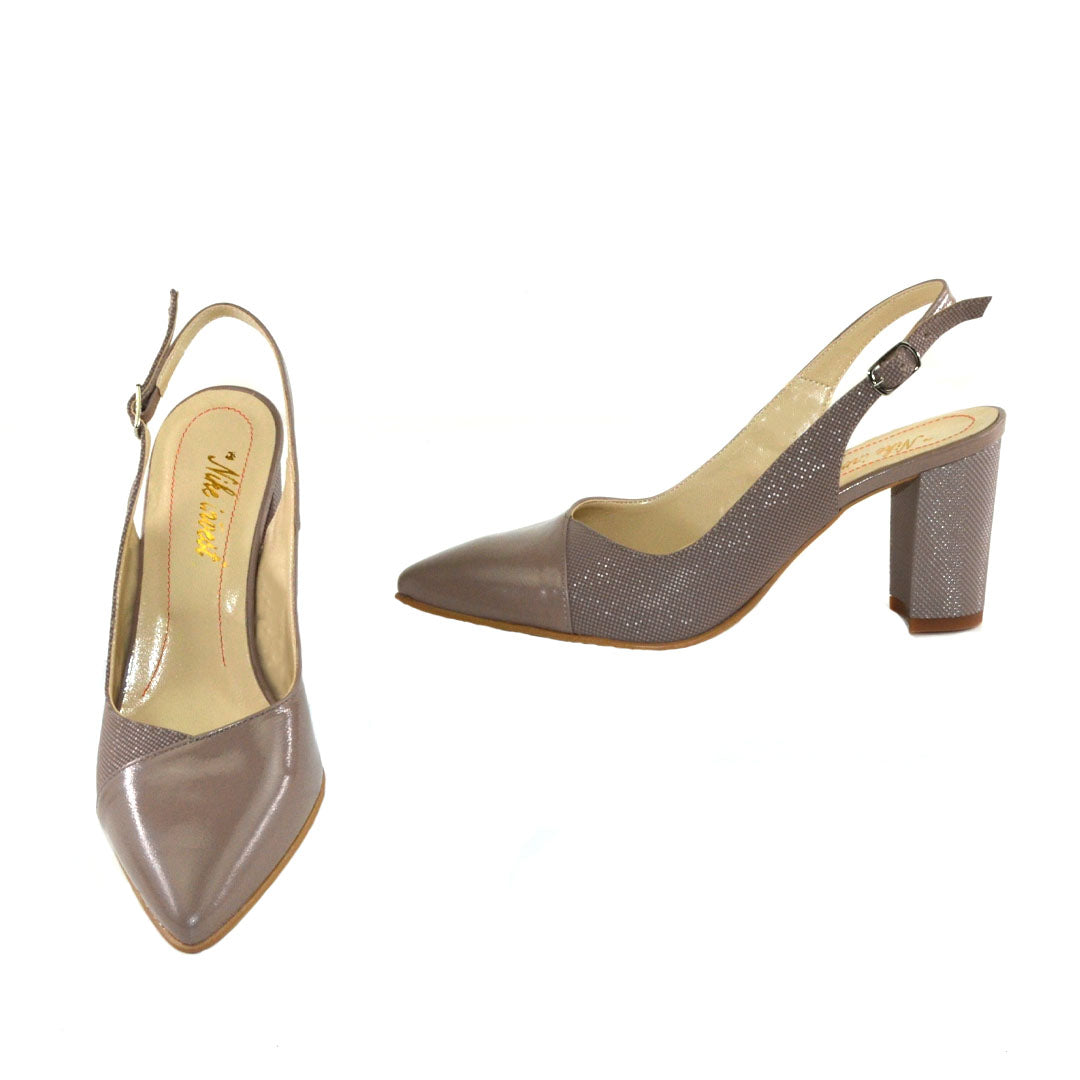 Pantofi eleganti dama din piele naturala -Material exterior piele naturala de culoare cafe lac+ cafe sidef-Dimensiune toc: 6,5 cm -Varful ascutit -Datorita versatilitatii si culorilor sunt usor de asortat-Brantul pantofilor este prevazut cu un buret special care ofera un plus de comoditate Pantofi produsi in Romania