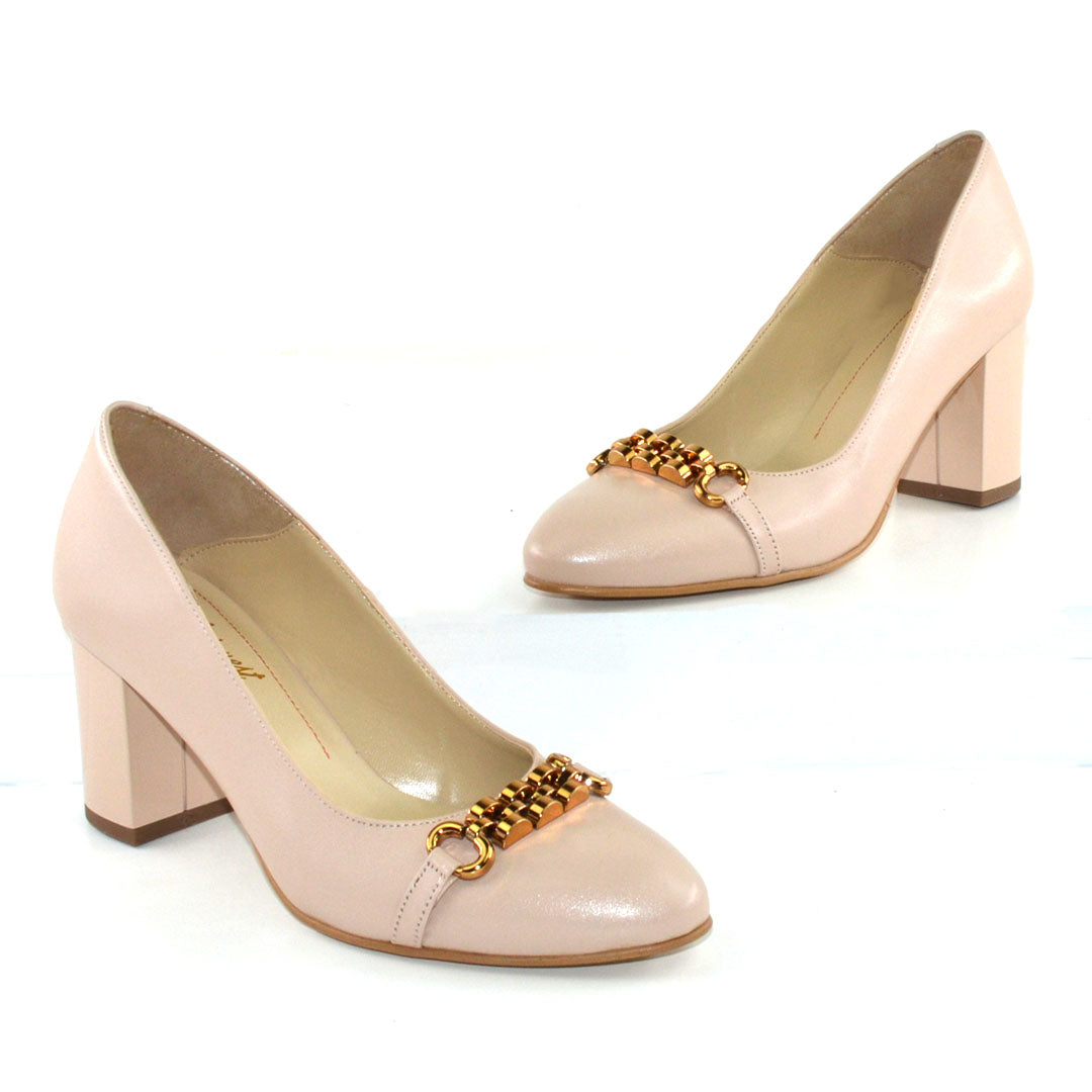 -Pantofi eleganti piele naturala -Interior din piele naturala -Exterior din piele de culoare bej cu ornament auriu -Inaltime toc 6 cm-Sunt pantofii ideali pentru ca outfitul tau sa iasa din anonimat..Brantul pantofilor este prevazut cu un buret special care ofera un plus de comoditate-Pantofi produsi in Romania