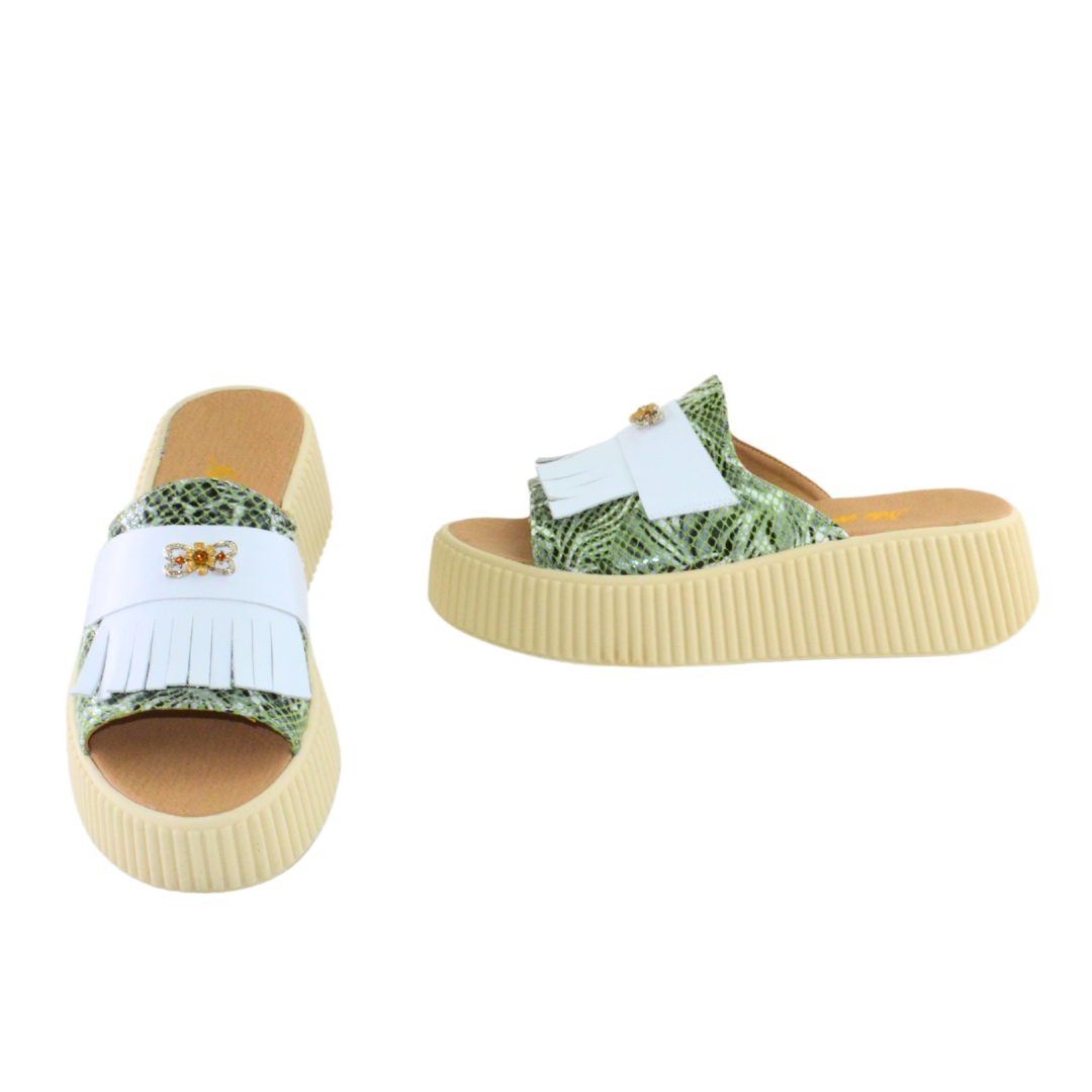 Papuci de dama talpa groasa pentru vara,Exterior Piele naturala de culoare verde si alba. varf rotund cu inserti pe exterioru talpi Interior piele naturala Talpa ortopedica bej. Inaltime talpi 5 cm spate si 2, cm fata Brantul sandalelor este prevazut cu un buret special care ofera un plus de comoditate