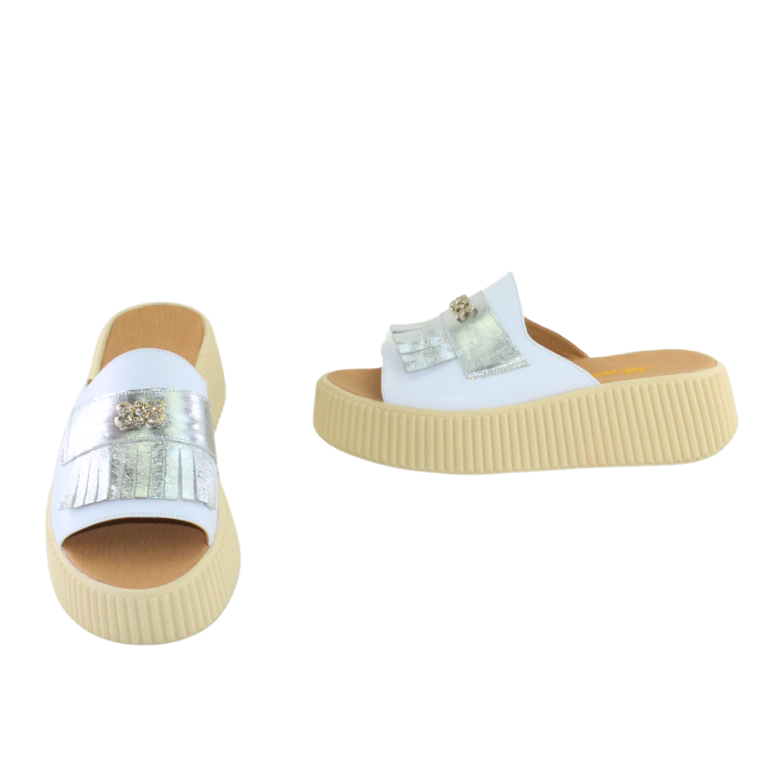 Papuci de dama talpa groasa pentru vara,Exterior Piele naturala de culoare alb si argintiu  varf rotund cu inserti pe exterioru talpi Interior piele naturala Talpa ortopedica bej. Inaltime talpi 5 cm spate si 2, cm fata Brantul sandalelor este prevazut cu un buret special care ofera un plus de comoditate