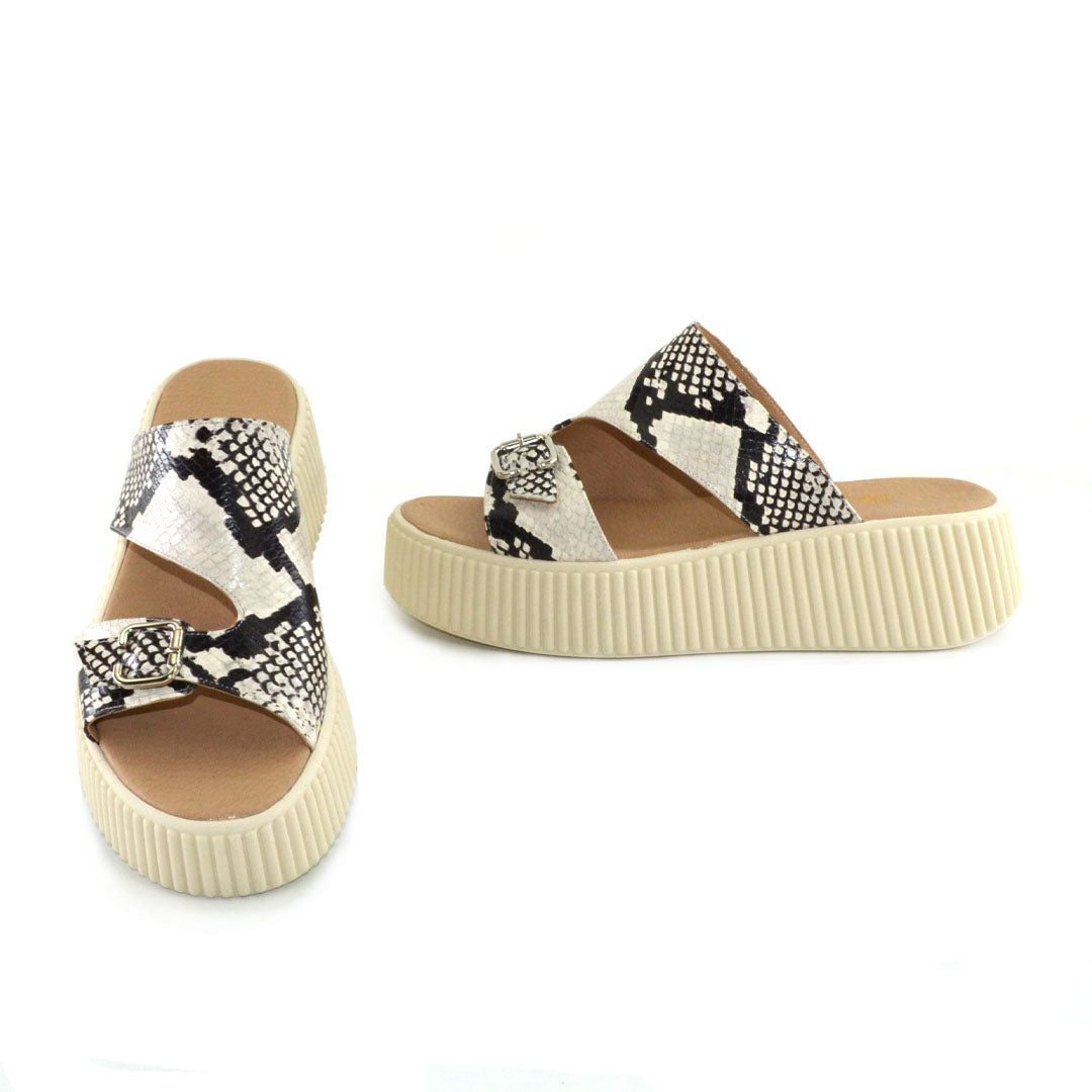 Papuci de dama talpa groasa pentru vara,Exterior Piele naturala de culoare bej cu negru [croco] varf rotund cu inserti pe exterioru talpi Interior piele naturala Talpa ortopedica bej. Inaltime talpi 5 cm spate si 2, cm fata Brantul sandalelor este prevazut cu un buret special care ofera un plus de comoditate