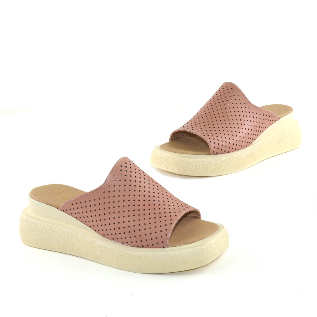 - Papuci piele naturala capucino perforat - Papuci cu burete special extra-confort - Talpa bej , varf rotund, brant interior cu burete special , mesina naturala bej - Inaltime toc: 4 cm ,