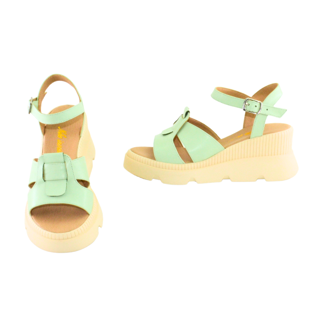 Sandale de dama talpa groasa pentru vara,Exterior Piele naturala de culloare verde deschis varf rotund cu inserti se talpa Interior piele naturala. Inaltime talpi 7 cm spate si 2,5, cm fata. Talpa ortopedica bej. Brantul sandalelor este prevazut cu un buret special care ofera un plus de comoditate