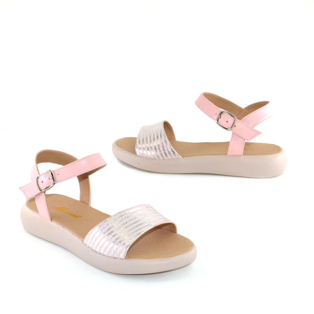 Sandale de dama pentru vara,Exterior Piele naturala de roz cu dungi arginti'cu catarma nikel, cu varf rotund cu talpa negra Interior piele natural. Inaltime talpi 3 cm spate si 1,5, cm fata Brantul sandalelor este prevazut cu un buret special care ofera un plus de comoditate