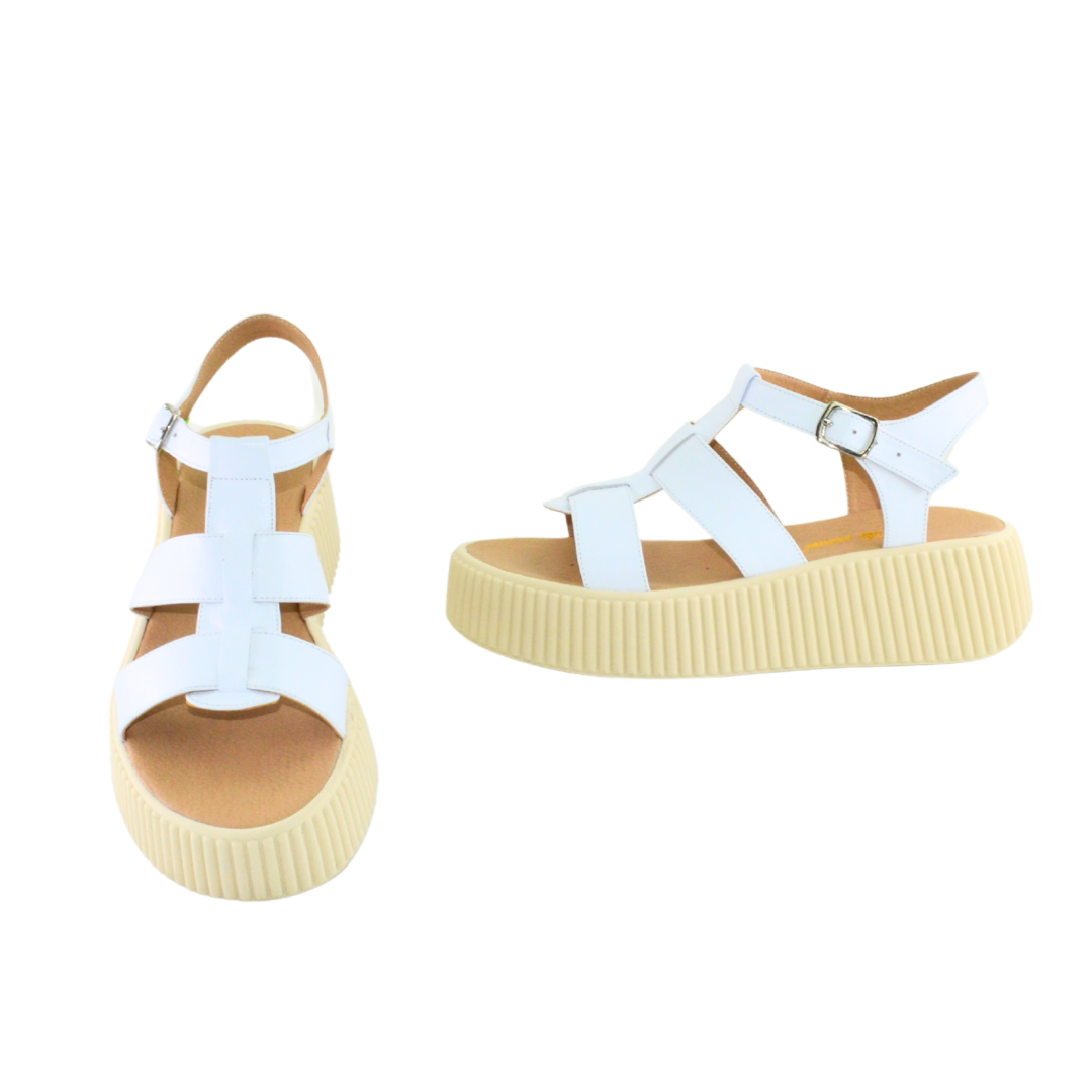Sandale de dama talpa groasa pentru vara,Exterior Piele naturala de culloare alba varf rotund cu inserti se talpa Interior piele naturala Talpa ortopedica bej. Inaltime talpi 7 cm spate si 2,5, cm fata Brantul sandalelor este prevazut cu un buret special care ofera un plus de comoditate