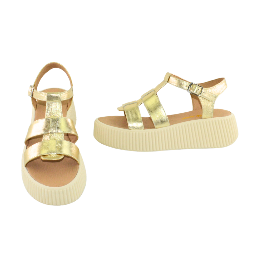 Sandale de dama talpa groasa pentru vara,Exterior Piele naturala de culloare aurie varf rotund cu inserti se talpa Interior piele naturala Talpa ortopedica bej. Inaltime talpi 7 cm spate si 2,5, cm fata Brantul sandalelor este prevazut cu un buret special care ofera un plus de comoditate