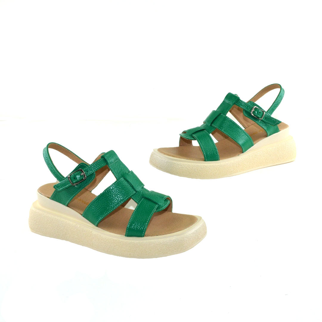 Sandale de dama talpa groasa pentru vara Exterior Piele naturala de culloare verde cu varf rotund Interior piele naturala Talpa bej. Inaltime talpi 7 cm spate si 2,5, cm fata Brantul sandalelor este prevazut cu un buret special care ofera un plus de comoditate
