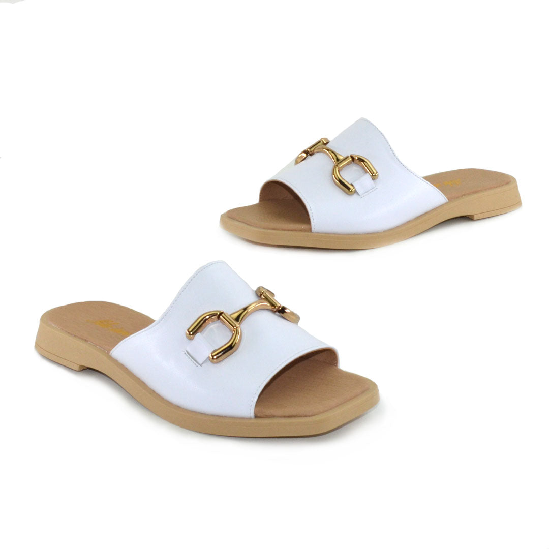 Papuc de dama pentru vara,Exterior Piele naturala de culoare alb' varf patrat cu talpa bej Interior piele natural. Inaltime talpi 2,5 cm spate si 1,5, cm fata Brantul sandalelor este prevazut cu un buret special care ofera un plus de comoditate