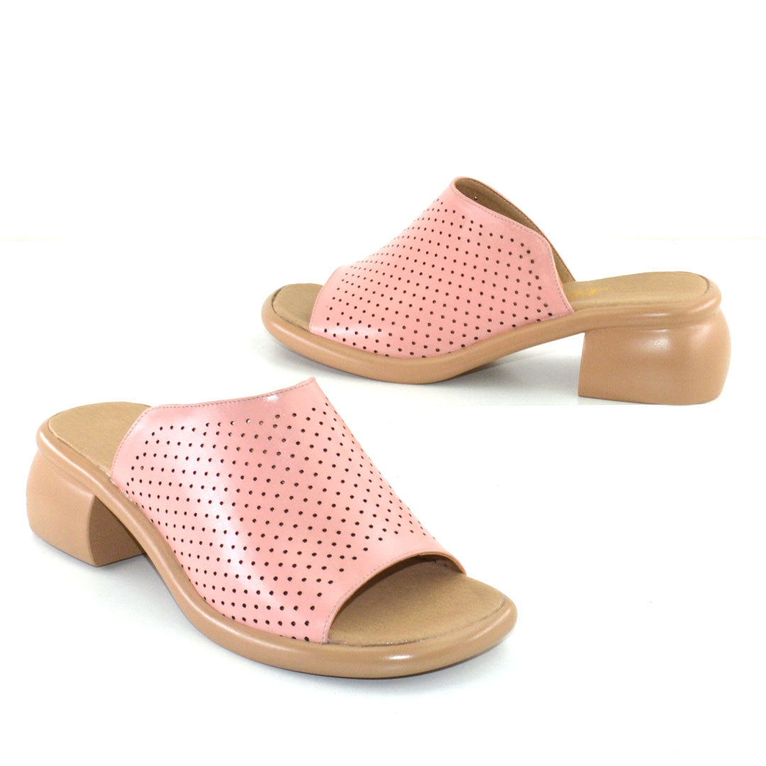 Papuc de dama pentru vara perforat,Exterior Piele naturala de culoare roz' varf patrat cu talpa capucino Interior piele natural. Inaltime talpi 4,5 cm spate si 1,5, cm fata Brantul sandalelor este prevazut cu un buret special care ofera un plus de comoditate