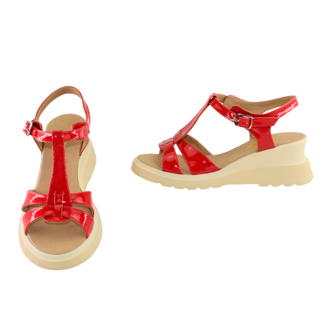Sandale de dama talpa groasa pentru vara,Exterior Piele naturala de culoare rosie, varf rotund cu inserti se talpa Interior piele naturala Talpa ortopedica bej. Inaltime talpi 7 cm spate si 2,5, cm fata Brantul sandalelor este prevazut cu un buret special care ofera un plus de comoditate.