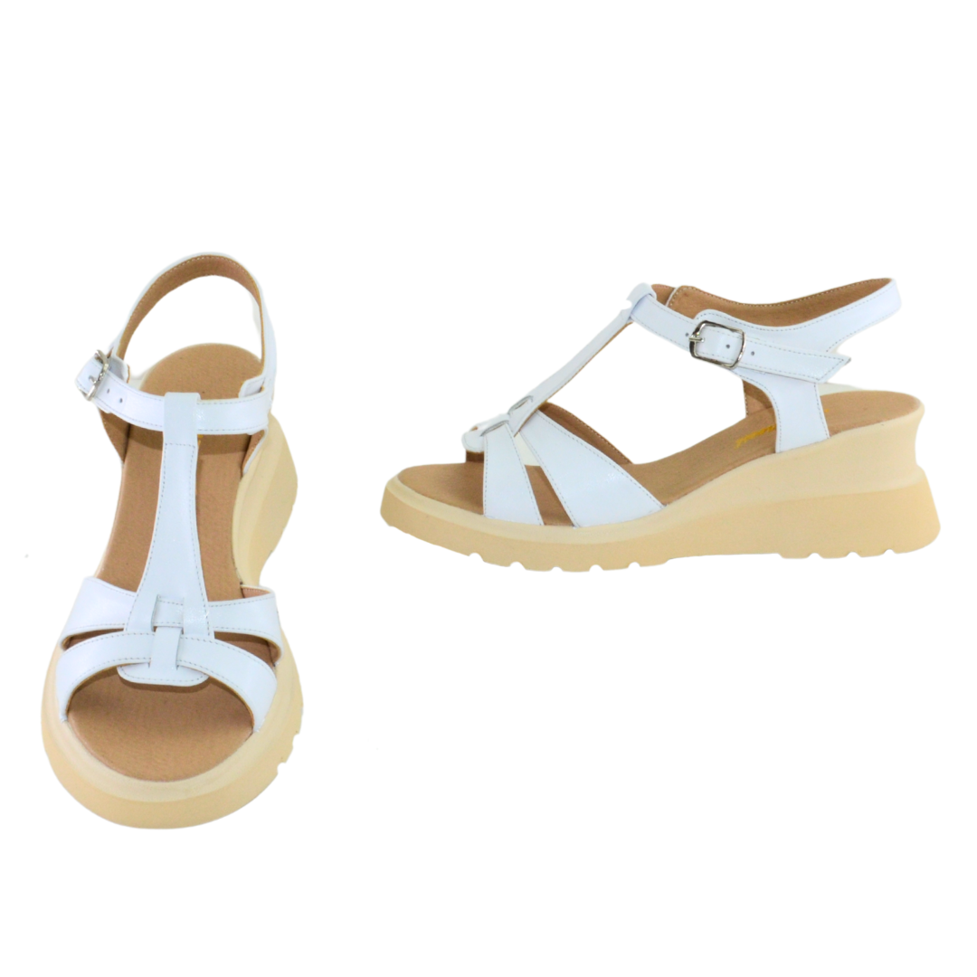 Sandale de dama talpa groasa pentru vara,Exterior Piele naturala de culoare alba, varf rotund cu inserti se talpa Interior piele naturala Talpa ortopedica bej. Inaltime talpi 7 cm spate si 2,5, cm fata Brantul sandalelor este prevazut cu un buret special care ofera un plus de comoditate.