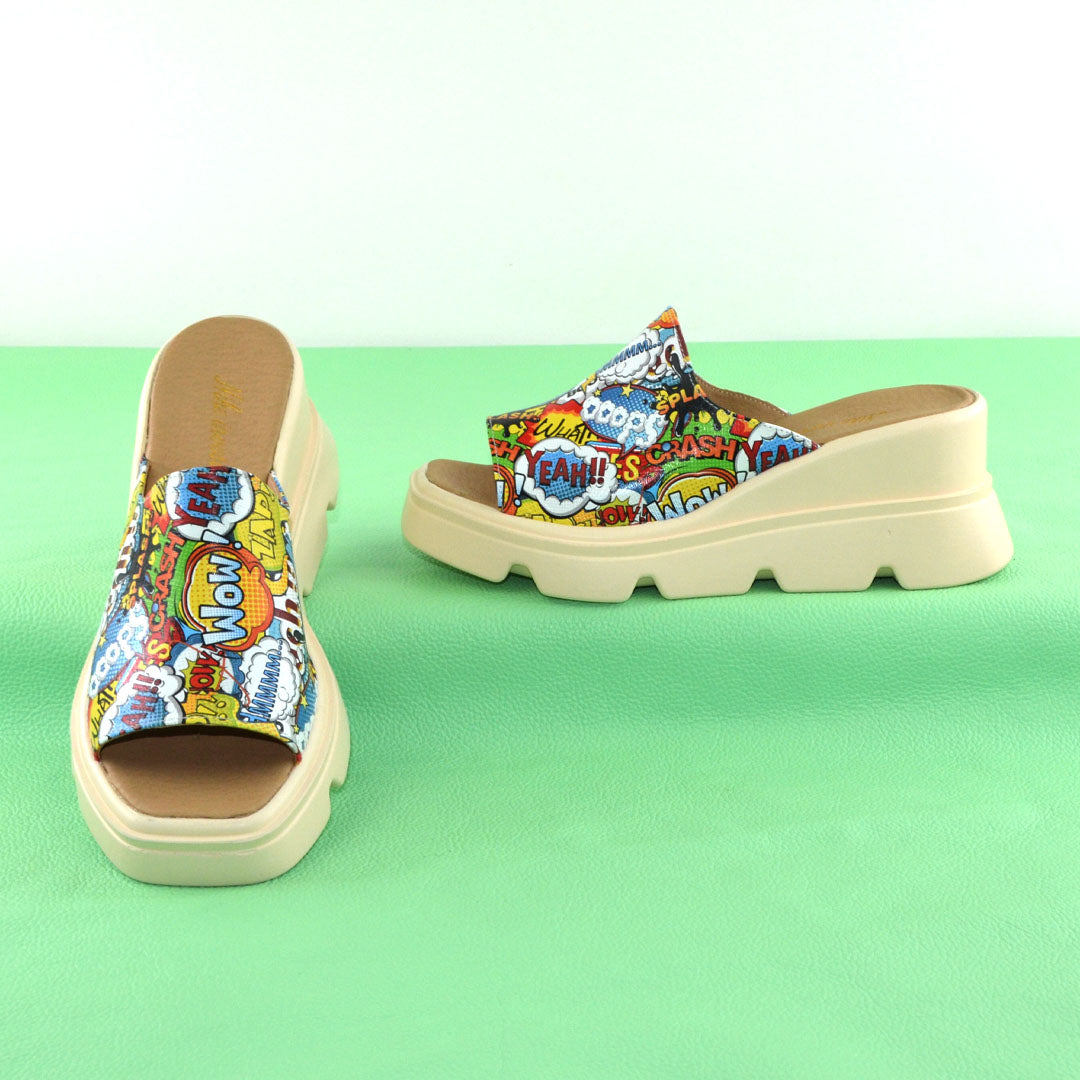 Papuci de dama talpa groasa pentru vara Exterior Piele naturala de culloare multicolor cu varf patrat Interior piele naturala Talpa bej. Inaltime talpi 7 cm spate si 2,5, cm fata Brantul sandalelor este prevazut cu un buret special care ofera un plus de comoditate
