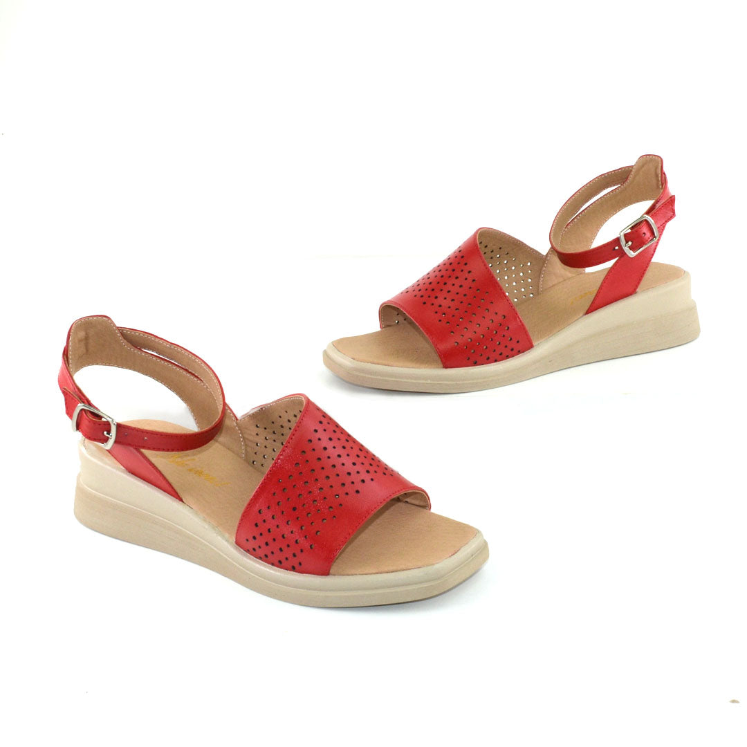 Sandale din piele naturala box rosu perforat - Interior din piele naturala. Sistemul de inchidere este prin catarama metalica rezistenta, care isi pastreaza culoarea si nu oxideaza. Talpa ortopedica de inaltime medie ofera stabilitate si confort pe toata perioada purtarii. Inaltimea tocului masoara 4,5 cm.