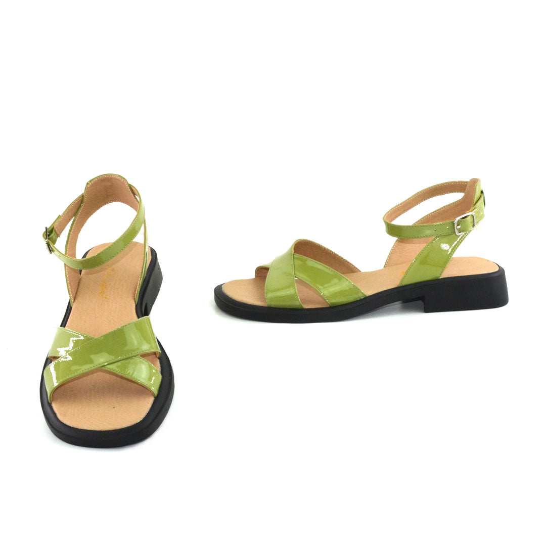 Sandale de dama pentru vara,Exterior Piele naturala de culoare verde lac' varf rotund cu talpa negra Interior piele natural. Inaltime talpi 3 cm spate si 1,5, cm fata Brantul sandalelor este prevazut cu un buret special care ofera un plus de comoditate