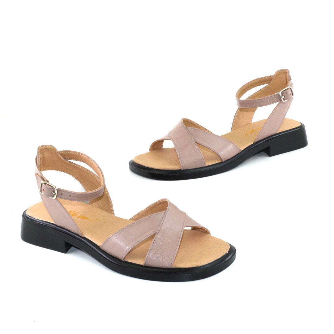 Sandale de dama  pentru vara,Exterior Piele naturala de culoare bej cafe' varf rotund cu talpa negra Interior piele natural. Inaltime talpi 3 cm spate si 1,5, cm fata Brantul sandalelor este prevazut cu un buret special care ofera un plus de comoditate