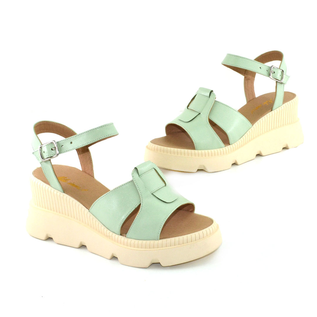 Sandale de dama talpa groasa pentru vara Exterior Piele naturala de culloare prazuliu cu varf rotund Interior piele naturala Talpa bej. Inaltime talpi 7 cm spate si 2,5, cm fata Brantul sandalelor este prevazut cu un buret special care ofera un plus de comoditate