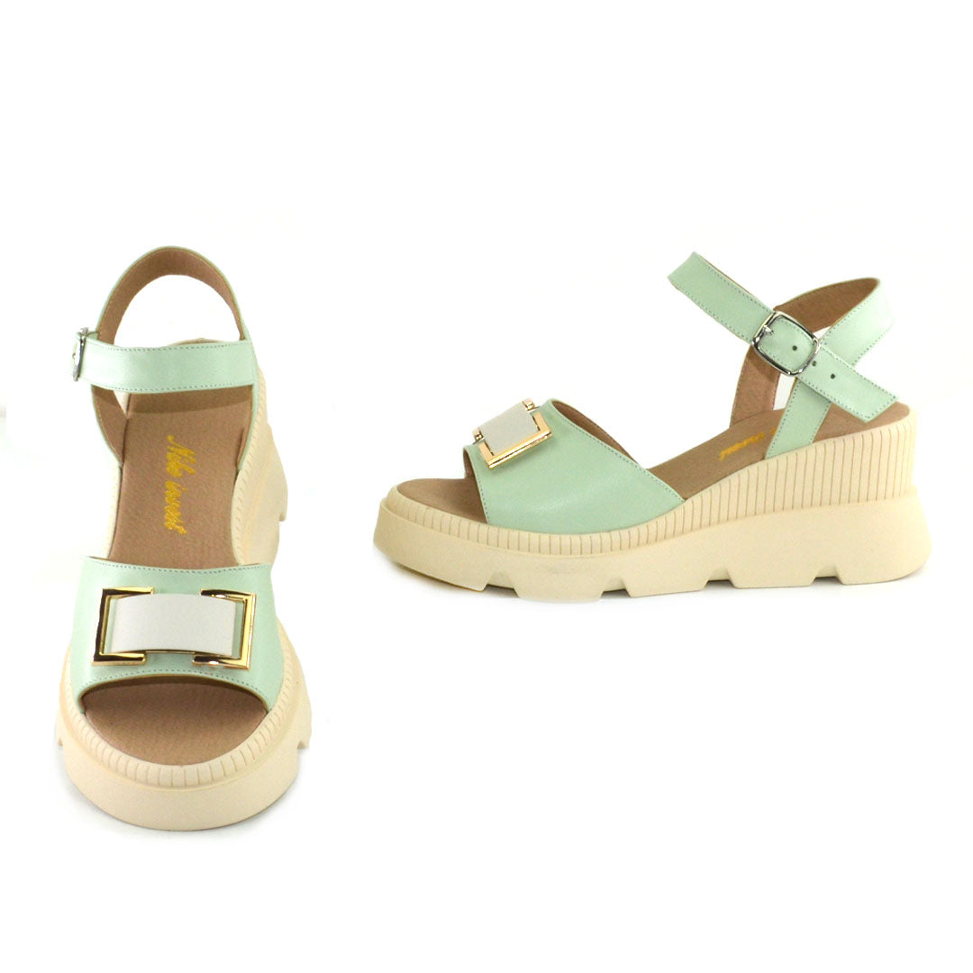 Sandale de dama talpa groasa pentru vara,Exterior Piele naturala de culloare verde deschis varf rotund cu inserti se talpa Interior piele naturala Talpa ortopedica bej. Inaltime talpi 7 cm spate si 2,5, cm fata Brantul sandalelor este prevazut cu un buret special care ofera un plus de comoditate